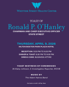 Whittier Street Health Center, a community health center with a mission to serve as a center of excellence that provides high quality and accessible health care and social services that achieve health equity, social justice, and the economic well-being of a diverse patient population, is proud to present a Toast to Ron O’Hanley, chairman and CEO of State Street, to be held on Thursday, April 9, at the Hilton Boston Park Plaza Hotel.